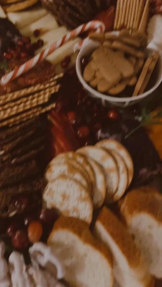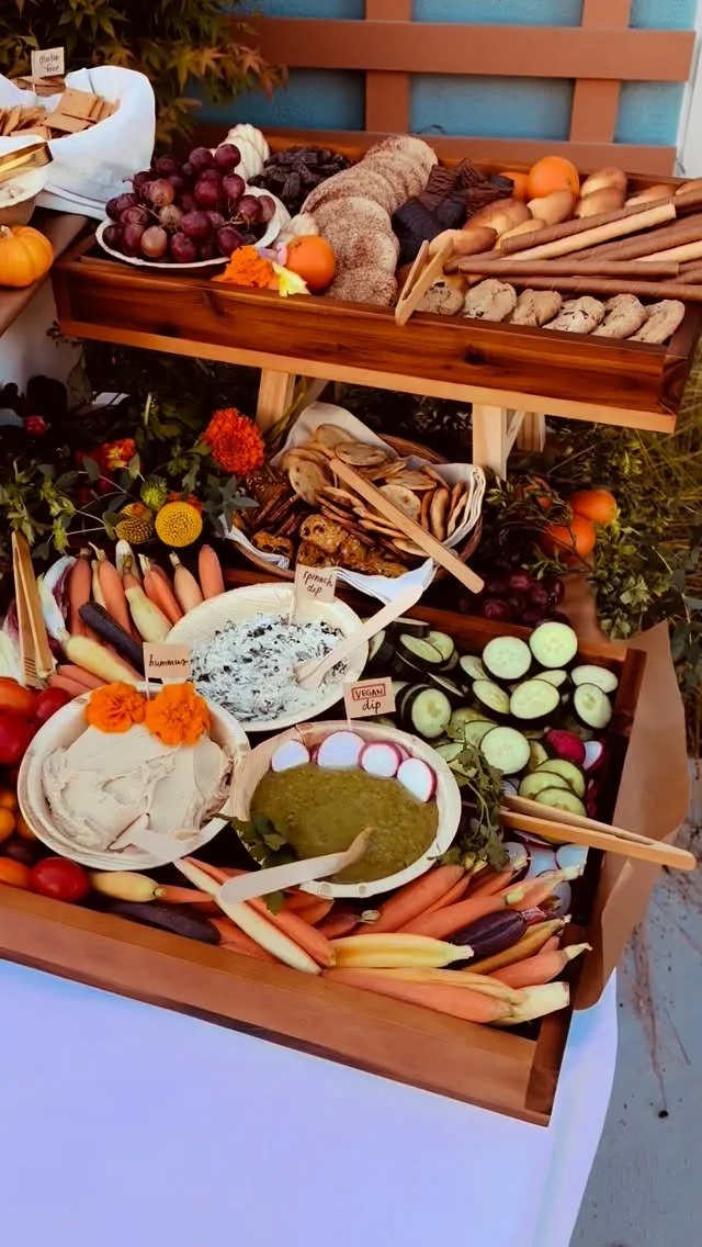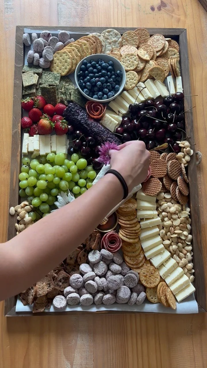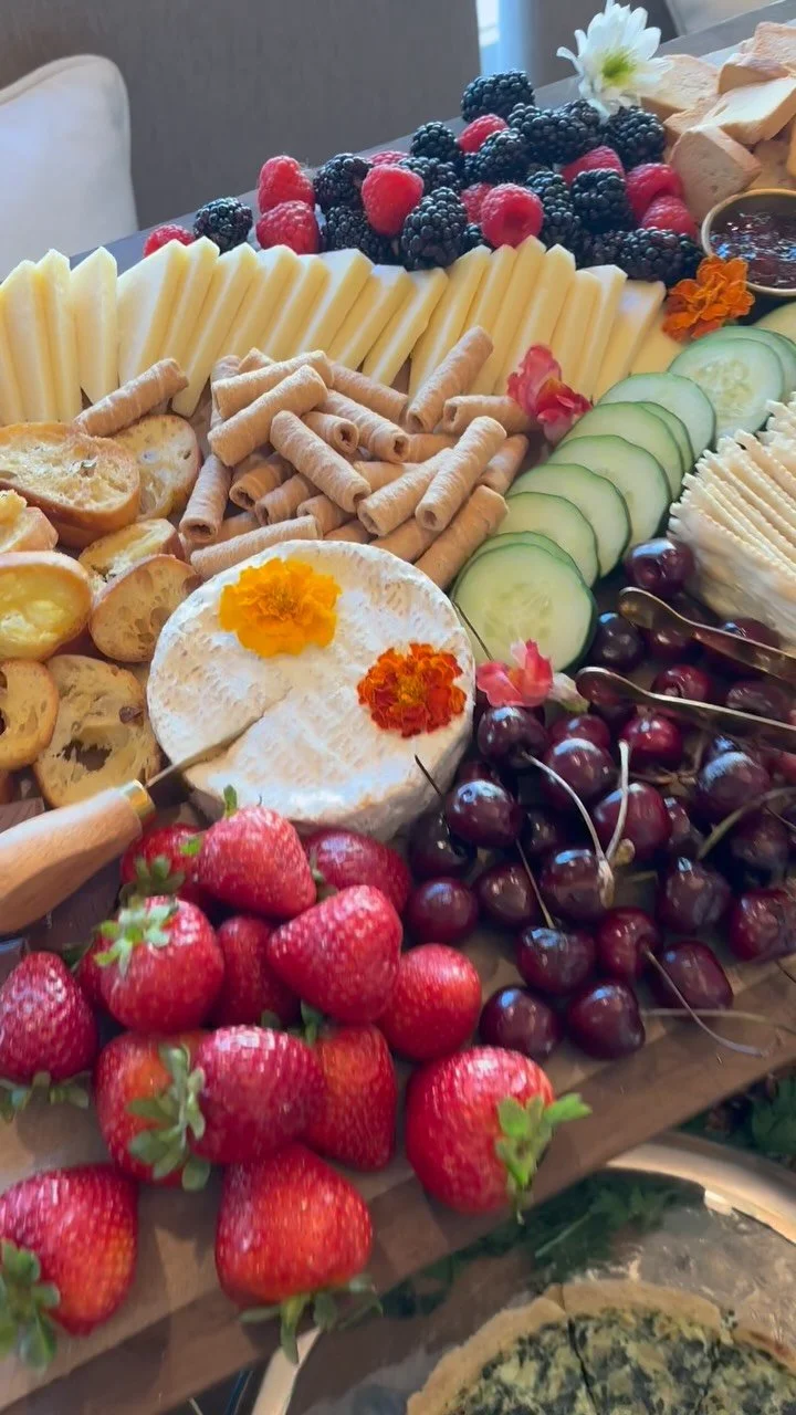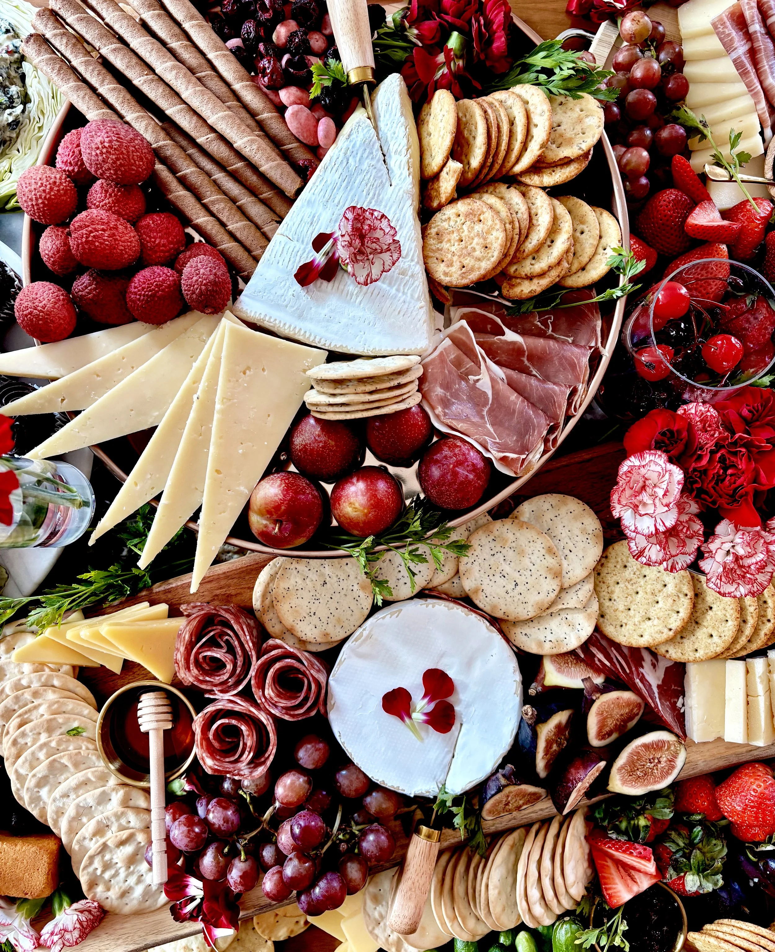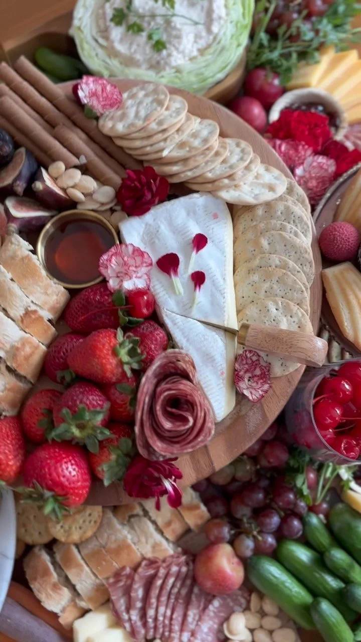 Fresh florals and greenery elevate our boards from just a buffet to a gourmet dining experience.